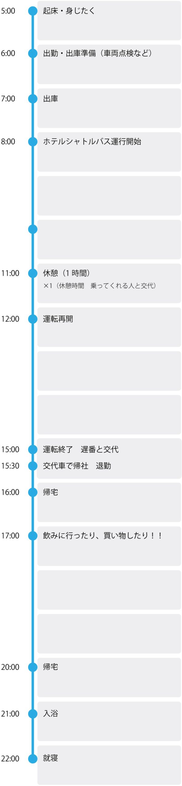 ホテルのシャトルバスを運行しているという点に惹かれました。「接客と運転、バランス良くやりたい!」と思っていたのでこの会社だ!と思いました。